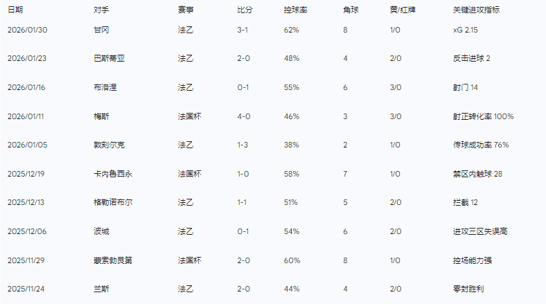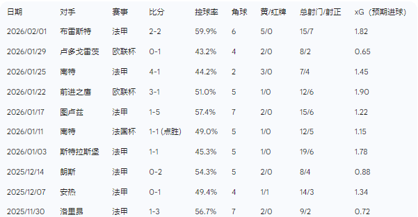 尼斯在近十场比赛中仅取得一场常规时间内的胜利,其余场次呈现出严重的平局倾向或溃败特征。下表详细列出了尼斯近十场正式比赛的关键数据: